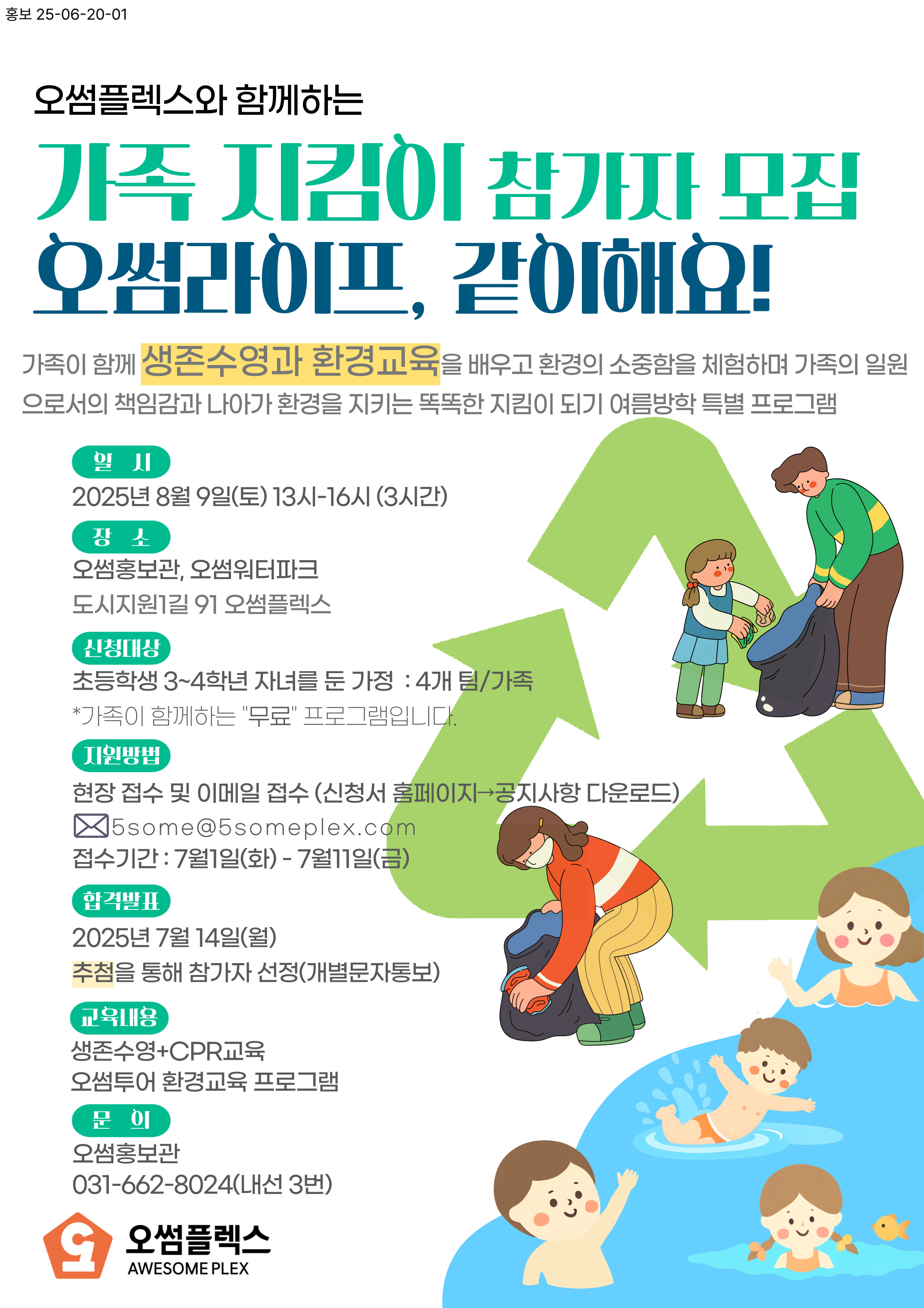 오썸플렉스와 함께하는 가족지킴이(환경교육+생존수영) 여름방학 특별프로그램 안내