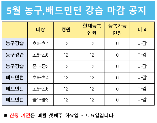 2020년 5월 농구,배드민턴 강습 마감 공지